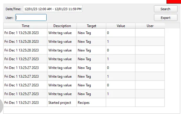 The audit log keeps track of all user actions that occur during runtime. Any user activity, such as changing a tag value and logging in, will be tracked in the audit log. The audit log table shows all of the actions users take in the form of a time, description, target, value, and the user.