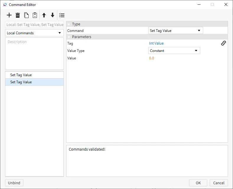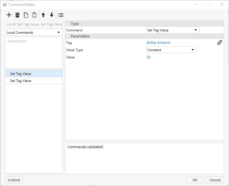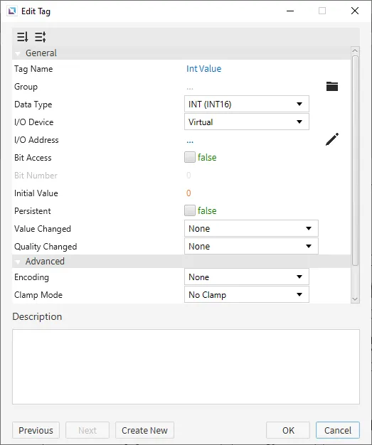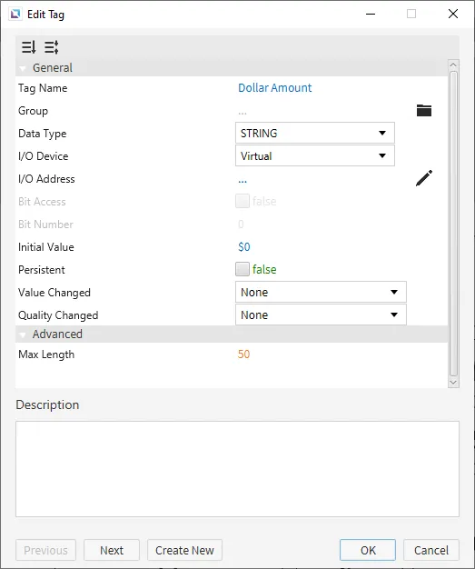 Create two tags. One tag will be named "Dollar Amount" and will be set as a STRING tag. The default value will be '$0'. The other tag will be named "Int Value" and will be set as an INT16 tag. The default value will be set to 0. When done creating a tag, click OK to finalize the changes.