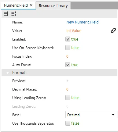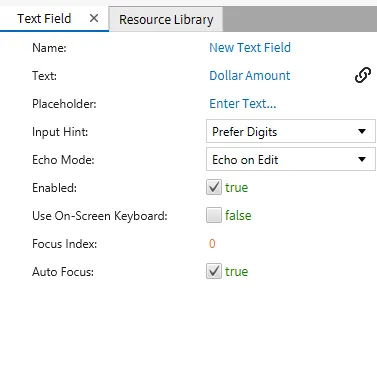 Create a Text Field object and a Numeric Field object. Click Insert > Text Field or the Insert Text Field icon in the toolbar. Click and drag on the page to bring up the Text Field object. Click Insert > Numeric Field or the Insert Numeric Field icon in the toolbar. Click and drag on the page to bring up the Numeric Field object. Bind the tag 'Dollar Amount' to the Text Field object and the tag 'Int Value' to the Numeric Field object. Be sure to disable the on-screen keyboard for both field objects.