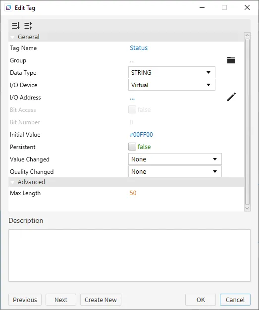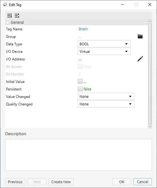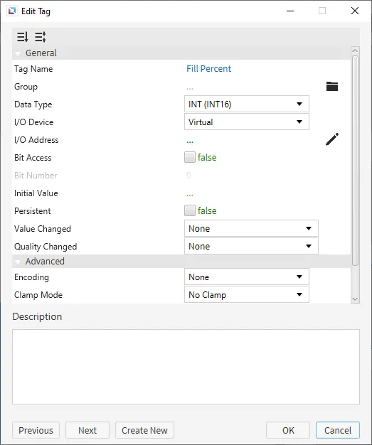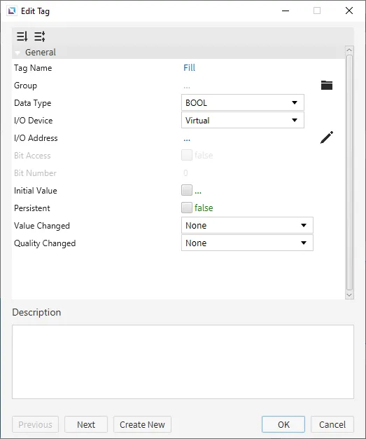 Create five tags. The first tag will be named "Fill" and will be a BOOL tag. The second tag will be named "Fill Percent" and will be an INT16 tag. The third tag will be named "Status" and will be a STRING tag. The default value will be '#00FF00'. The fourth tag will be named "ON" and will be a BOOL tag. The fifth tag will be named "Drain" and will be a BOOL tag. Set the initial values for each tag as shown below.