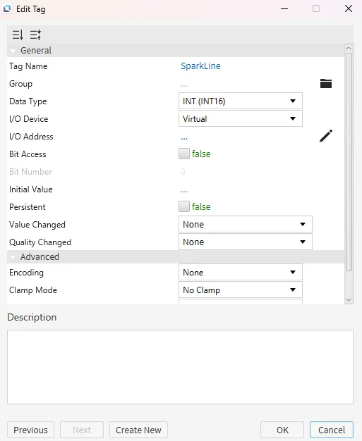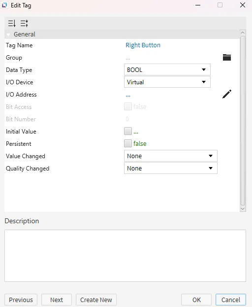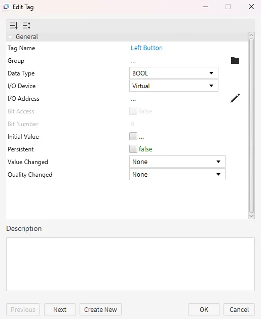 - Begin by creating 3 tags in total. Left Button will be a BOOL Tag, Right Button will be a BOOL Tag and SparkLine will be an Int Tag.