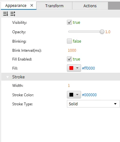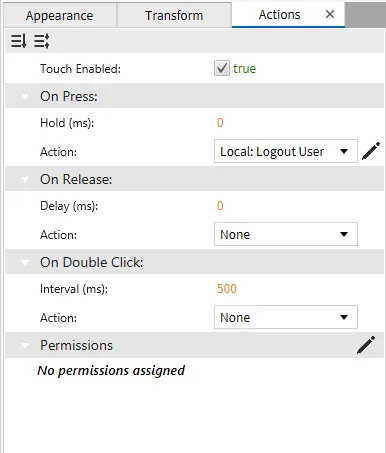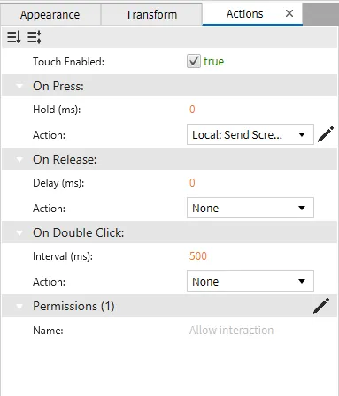 - Now, create a Circle to the right of the Rectangle and the circle. Change the fill to Red or #ff0000. Then select Actions under Permissions and click the pen to add permissions. Click the Checkbox next to allow interaction. Click OK to confirm it. Under On Press to create a New Command. Select the Command “Send Screen Notification.” Have the Message be “User has sufficient Permission!” Click OK to confirm it. Click