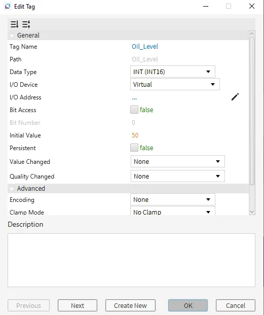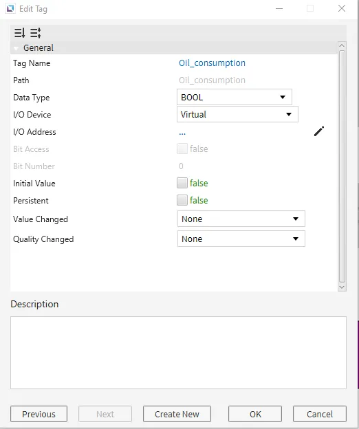 - Create two tags. One will be named “Oil_Level,” and the other will be called “Oil_consumption.” Oil_Level will be an INT (INT16) with an Initial Value of 50. Oil_consumption will be a BOOL with the starting value as False.