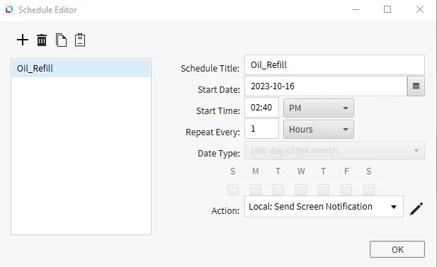 - Create a new Schedule. To achieve this, go to Tools > Schedule Editor. Click the + to create a new schedule; set the Schedule Title to “Oil_Refill.” Set the Start Date to the current date and the Start Time to 5 minutes from the present time. For example, if the current time is 2:30, the Start Time should be 2:35. Set the schedule to repeat every hour. Click the Action Field > Create New Commands. Create a Send Screen Notification Command; the message for this notification should be “Refill the oil.” Click OK to save and exit, and click OK again to exit the Schedule Editor.