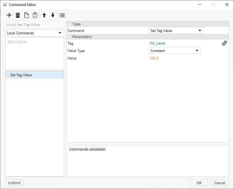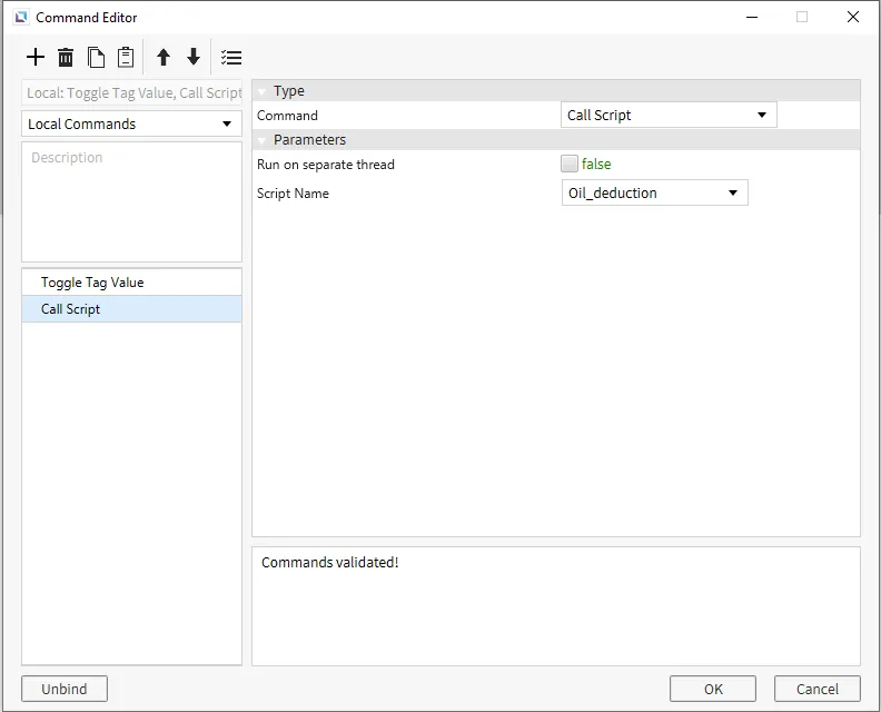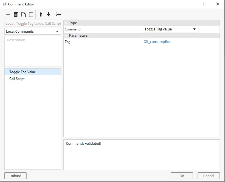 Once pasted in, close the Script Editor by clicking OK. Select the lamp and go to the Actions tab. If Actions does not display, go to View > Properties > Actions and check the box. Under On Press, click the Action field and Create New Command. Click on Add New Command and select Toggle Tag Value. In the Tag field, select the Oil_consumption tag. Then, in the top left of the Command Editor, click the + icon to create a new command. Change the new command to Call script and select the created script.