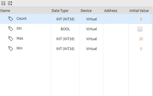 - Create 3 INT (INT16) tags named Count, Max, and Min. Count will have an Initial Value of 0. Max will have an Initial Value of 20. Min will have an Initial Value of 0. Lastly, create one BOOL tag named ON. The Initial Value should be false.