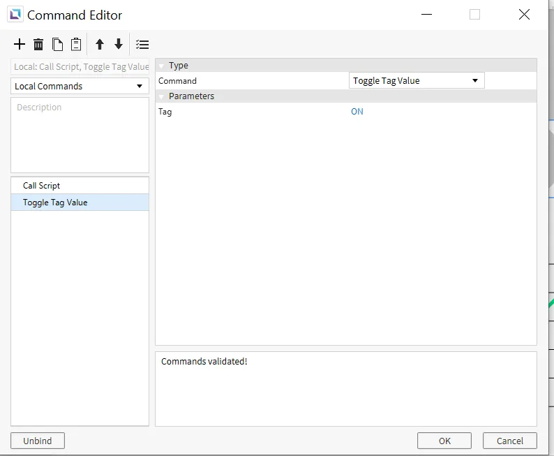 Once pasted in, close the Script Editor by clicking OK. Select the lamp and go to the Actions tab. If Actions does not display, go to View > Properties > Actions and check the box. Under On Press, click the Action field and Create New Command. Click on Add New Command and select Toggle Tag Value. In the Tag field, select the ON tag. Then, in the top left of the Command Editor, click the + icon to create a new command. Change the new command to Call Script and select the created script.
