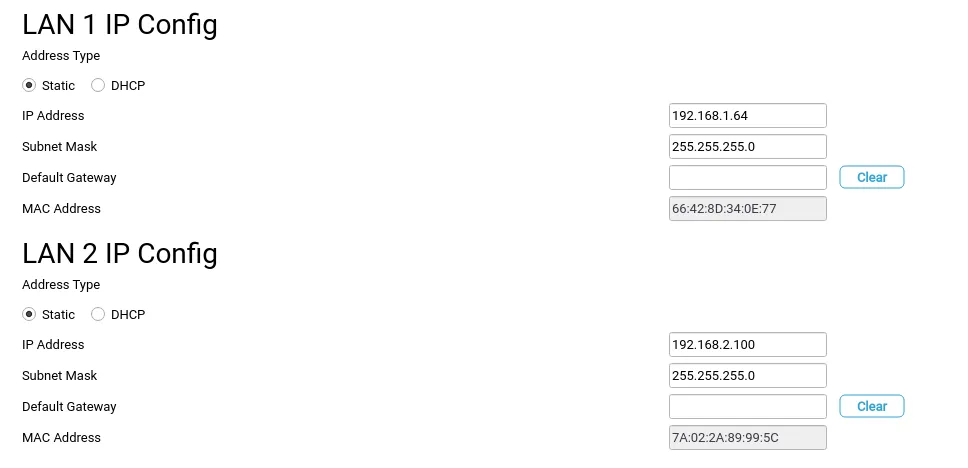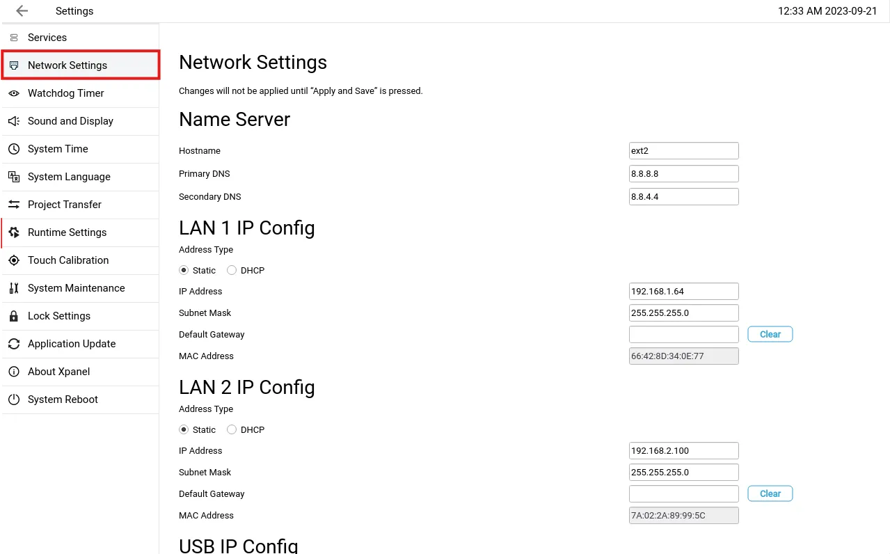 The LAN IP Config section configures the Ethernet ports on the Xpanel. All Xpanels will have two Ethernet ports except the 4-inch and -DE eXT2 models.