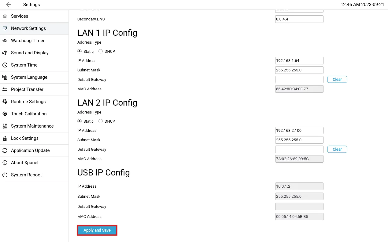 To save any changes to the network settings, scroll to the bottom of the page and click the Apply and Save button. If any changes are made and this button is not clicked, none of the changes will be saved.