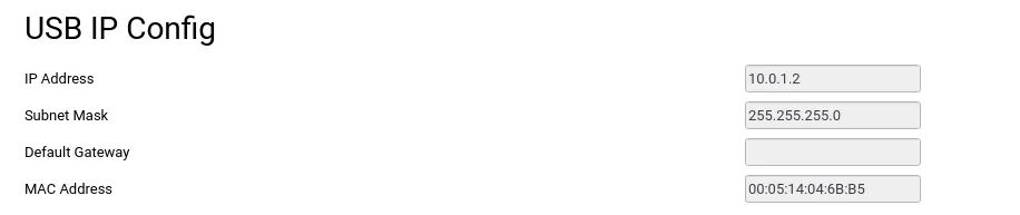 The USB IP Config displays the IP used for downloading projects over USB mini-B or USB-C. This section cannot be configured.