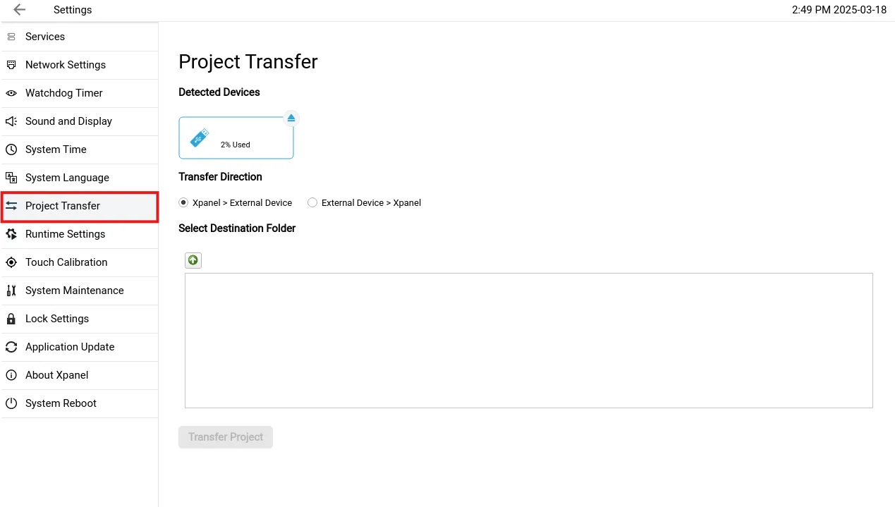 To upload or download a project from the external device, click Project Transfer.