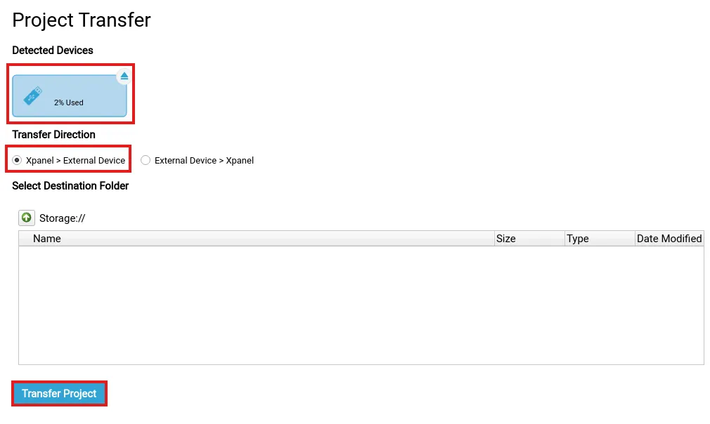 To upload the current project on the Xpanel to the external device, click the external device, Xpanel > External Device, and Transfer Project.