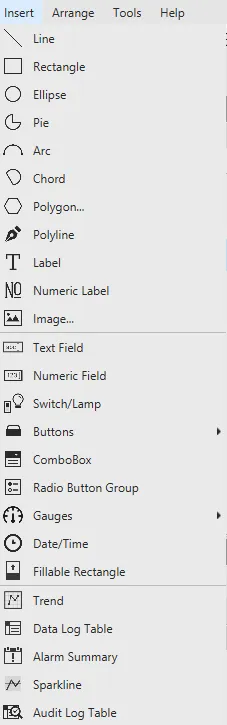 The Insert menu and Drawing Tools allow users to create objects and load images on a page. These objects include shapes, text, fields, buttons, gauges, Trends and Sparklines, Alarm Summaries, and Data and Audit Log Tables.