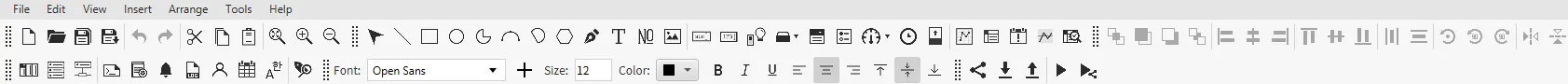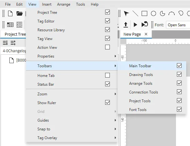 For example, users can control the visibility of each toolbar by clicking View > Toolbars > Main Toolbar, Drawing Tools, Arrange Tools, Connection Tools, Project Tools, or Font Tools and checking the boxes.