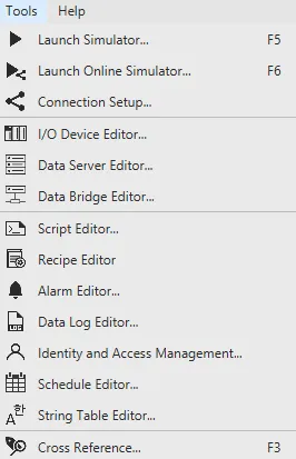 The Tools menu, Connection Tools, and Project Tools allow the user to launch the Simulator, connect to external devices, set up I/O and Data Server devices, edit scripts, recipes, alarms, data logs, schedules, and translations, manage users and permissions, and use the Cross Reference tool.