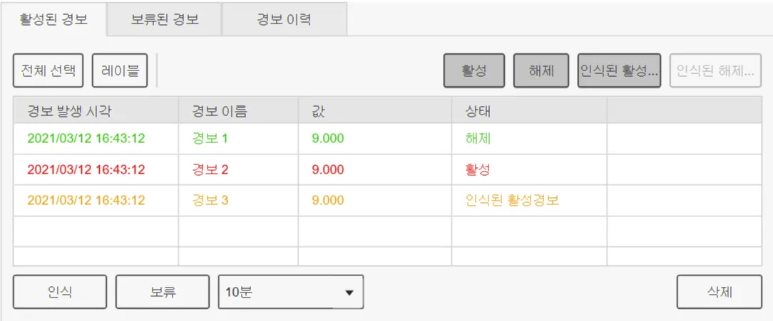 - 경보 이력(이전 알람) 탭으로 이동하여 그동안 발생했던 경보의 모든 이력을 확인할 수 있습니다.