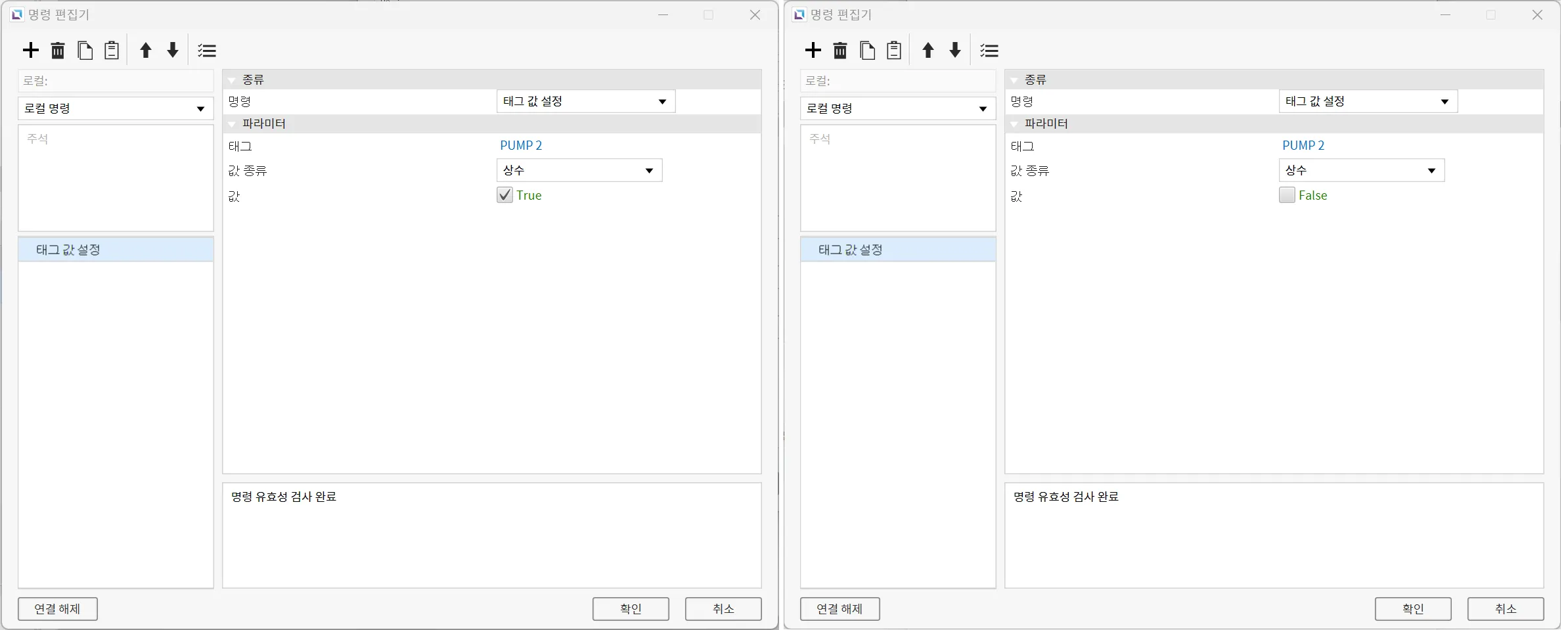 다음은 TANK LEVEL - LOW LOW의 경보 ON 시 동작과 경보 OFF 시 동작의 명령 설정입니다.