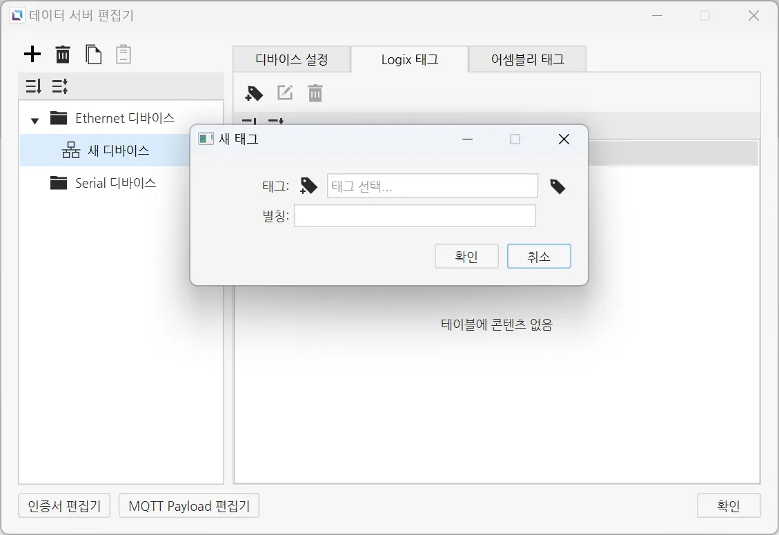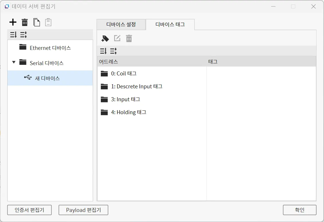 디바이스 태그는 서버에서 가져오고자 하는 데이터를 보유하고 있는 태그를 의미합니다. 데이터 서버는 이 탭에 등록된 모든 태그를 호스팅하며, 클라이언트 장비에서 서버로부터 가져오고자 하는 값의 어드레스를 여기서 설정할 수 있습니다.