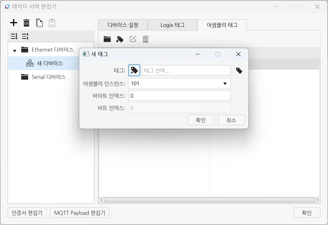 EtherNet/IP 서버는 호스트 된 EtherNet/IP 클라이언트 장비에 연결하기 위해 사용됩니다. 데이터 전송에 모든 태그를 사용하거나 Logix 태그 탭에서 전송하고자 하는 태그만 지정할 수 있습니다. 어셈블리 인스턴스는 번호와 데이터 크기를 지정하여 추가할 수 있습니다. 어셈블리 인스턴스가 생성되면 바이트, 비트 인덱스를 사용해 어셈블리 태그를 등록할 수 있습니다.