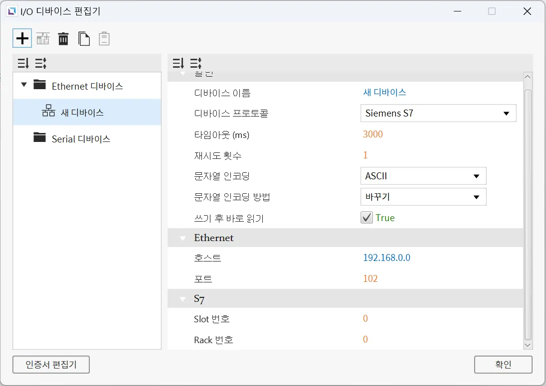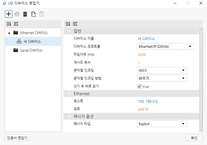 I/O 디바이스 편집기는 [도구] - **[I/O 디바이스 편집기]**를 클릭하거나 툴바의 I/O 디바이스 편집기 열기… 아이콘을 클릭하여 열 수 있습니다. 새 디바이스를 생성하려면 + 아이콘을 누릅니다. 디바이스 통신 종류를 Ethernet 또는 Serial로 설정할 수 있습니다. 각 종류마다 사용 가능한 I/O 디바이스 목록이 다르게 표시됩니다.