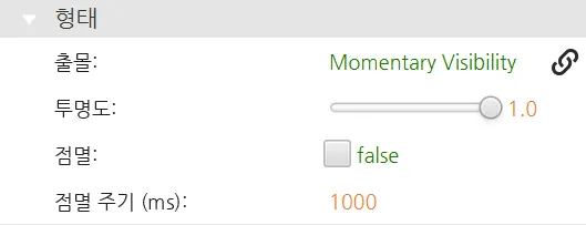 - 순간값 버튼의 형태 -> 출몰 속성에 "Momentary Visibility" 태그를 연결합니다.