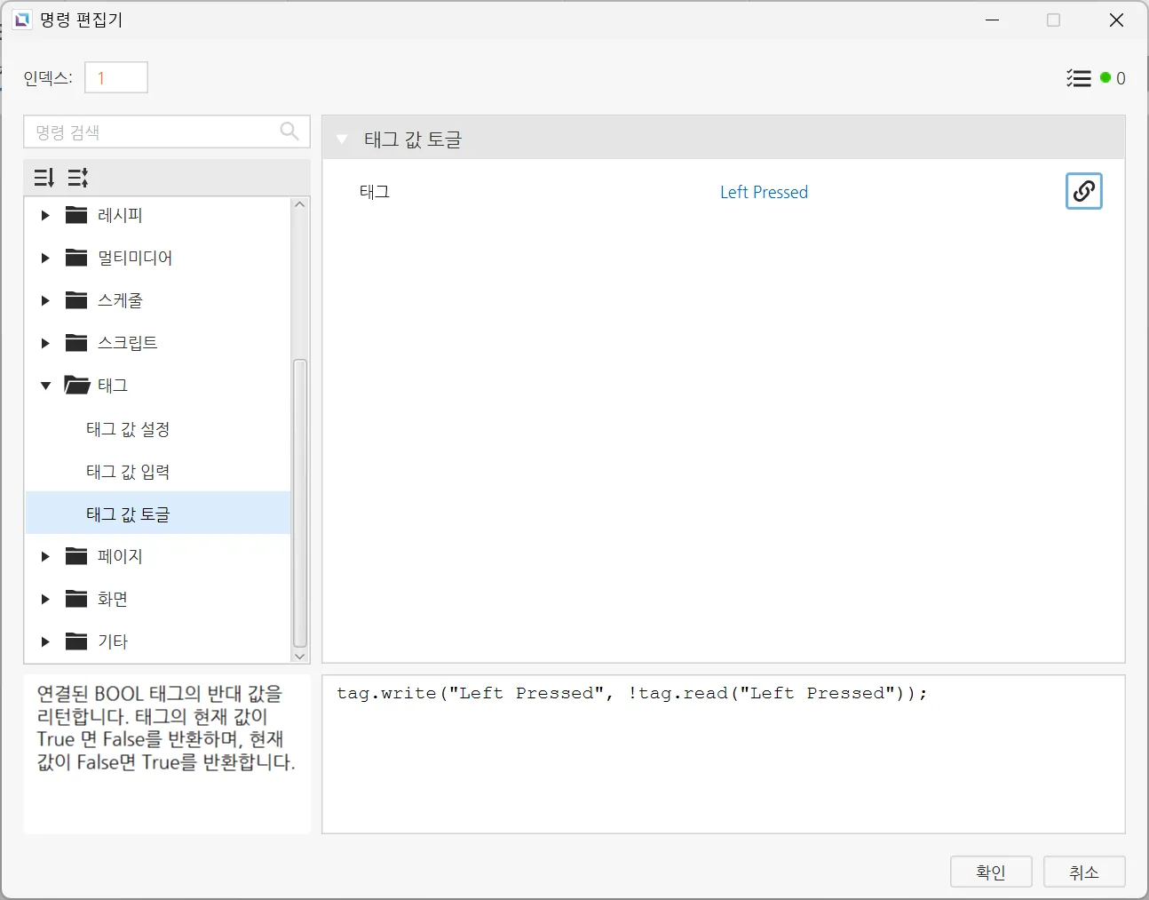 - 왼쪽 동작 버튼에는 “Left Pressed” 태그를 명령에 연결합니다.