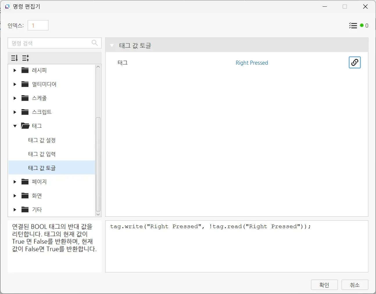 - 오른쪽 동작 버튼에는 “Right Pressed” 태그를 명령에 연결합니다.