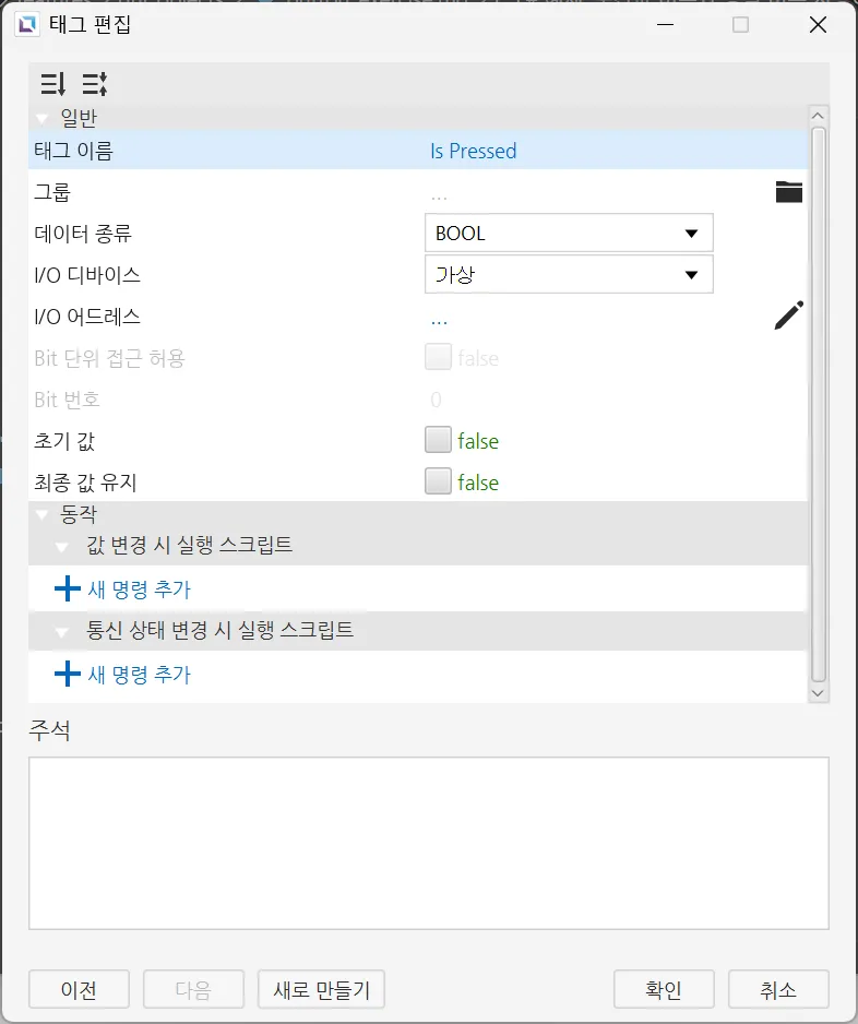 - 먼저 5개의 태그를 생성합니다. 태그 이름은 "Counting Down", "Momentary Visibility", "Is Pressed", "Left Pressed", 그리고 "Right Pressed" 입니다. 각 태그는 BOOL 데이터 유형이며, 초기값은 false로 되어 있습니다.