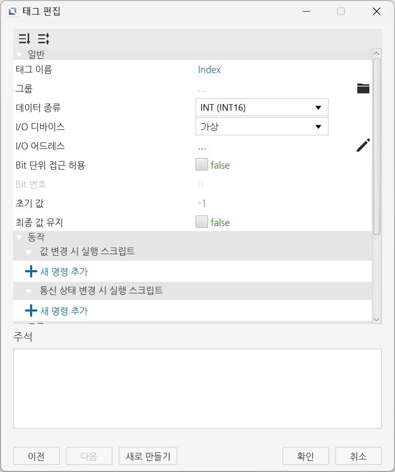 본 예제는 태그 6개를 사용합니다. 처음 태그의 이름은 Price로 설정하고, 데이터 종류는 **REAL (FLOAT32)**로 설정합니다. 두번째 태그의 이름은 Index로 설정하고, 데이터 종류는 INT (INT16), 초기 값은 -1로 설정합니다. 나머지 태그 4개는 데이터 종류를 **INT (INT16)**으로 설정하고, 이후 레시피 설정 시 각 파라미터에 사용합니다.