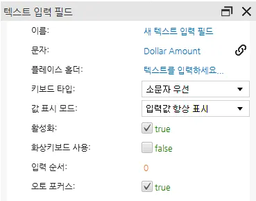 텍스트 입력 필드 오브젝트와 숫자 입력 필드 오브젝트를 생성합니다. 삽입 -> 텍스트 입력 필드를 클릭하거나 도구 모음의 텍스트 입력 필드 삽입 아이콘을 클릭합니다. 페이지에서 클릭하고 드래그하여 텍스트 입력 필드 오브젝트를 추가합니다. 삽입 -> 숫자 입력 필드를 클릭하거나 도구 모음의 숫자 입력 필드 삽입 아이콘을 클릭합니다. 페이지에서 클릭하고 드래그하여 숫자 입력 필드 오브젝트를 추가합니다. 태그 'Dollar Amount'를 텍스트 입력 필드 오브젝트에 연결하고 태그 'Int Value'를 숫자 필드 오브젝트에 연결합니다. 두 입력 필드 오브젝트에 대해 화상키보드 사용을 비활성화하는 것을 확인 해야 합니다.