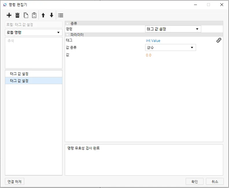 입력 키를 선택한 후 동작 탭으로 이동합니다. 각 입력 키에 대해 누를 때 동작을 설정합니다. 새 명령 추가 후 명령 편집기에서 동작의 명령 종류를 키 입력으로 설정합니다. 키의 파라미터는 해당하는 숫자 또는 기호로 설정합니다. 아래에 1번 키의 명령 편집기 예시가 나와 있습니다.
