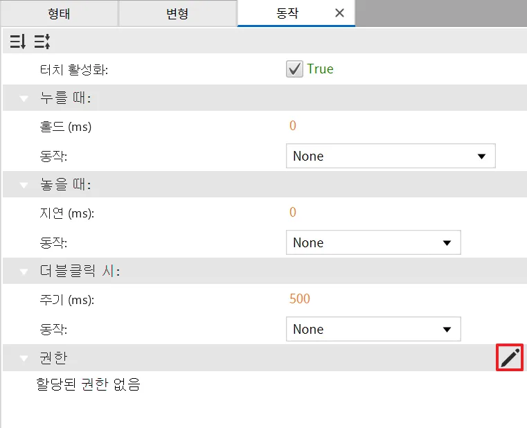 동작 설정이 가능한 오브젝트는 권한 설정 또한 가능합니다. 오브젝트에 권한을 할당하려면 동작 탭으로 이동해 권한 섹션에서 권한 변경 아이콘을 클릭합니다. 권한이 추가된 다음에는 해당 권한이 있는 사용자에 한하여 해당 오브젝트에 부여된 동작을 수행할 수 있습니다. 권한이 없는 사용자는 해당 오브젝트를 사용할 수 없습니다.