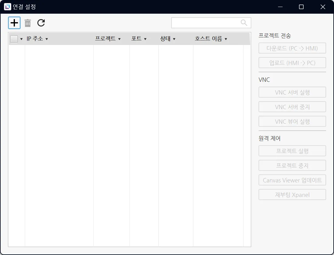프로젝트를 CIMON HMI에서 실행하려면 우선 Xpanel과 Canvas를 연결해야 합니다. 도구 > 연결 설정을 클릭하거나 툴바에서 **연결 설정창 열기…**를 클릭합니다. 연결 설정창이 열리면 나오는 HMI 목록에서 연결하고자 하는 장비를 선택할 수 있습니다. 연결된 방식에 따라 장비의 IP 어드레스가 표시되거나 USB라고 표시됩니다.