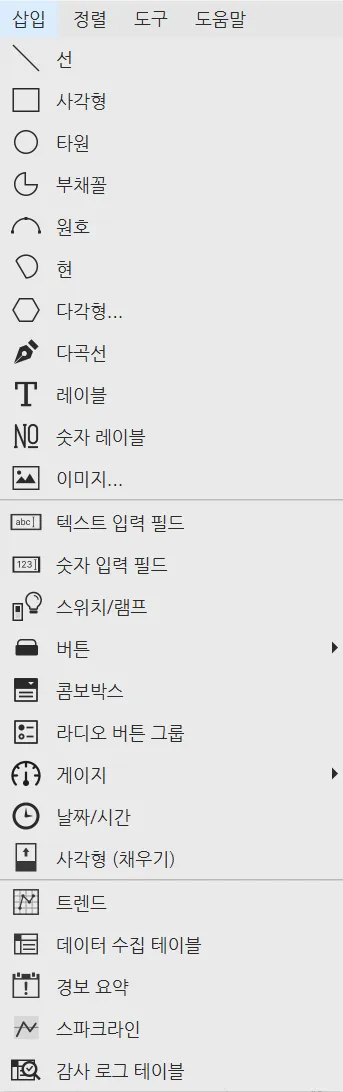 삽입 메뉴와 그림 도구는 사용자가 페이지에 오브젝트를 추가하거나 이미지를 등록할 때 사용됩니다. 일반 도형, 문자 오브젝트, 버튼, 게이지, 트렌드, 경보요약 등이 포함됩니다.
