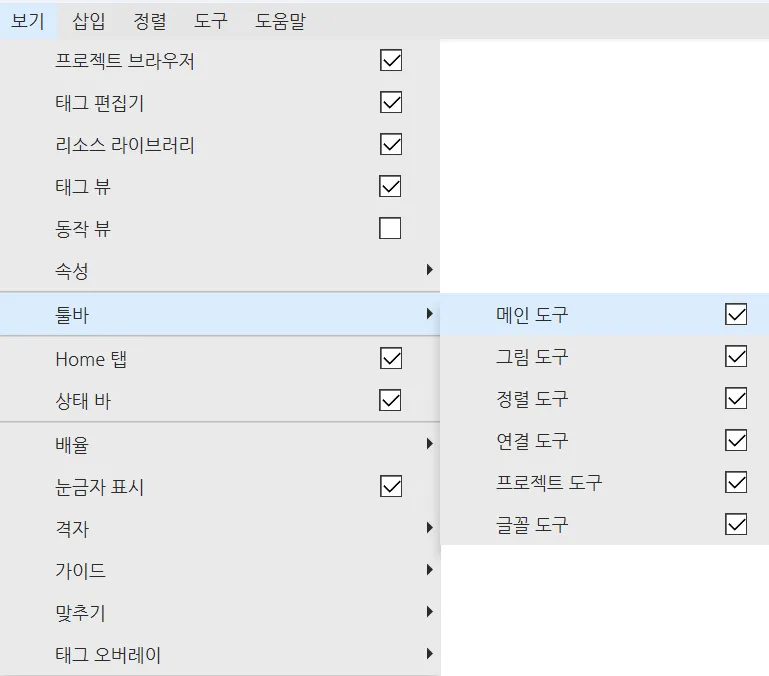 보기 메뉴는 툴바, 각종 설정 창의 표시 여부, 디자이너 화면 배율, 눈금 및 가이드 등을 조작하는데 사용됩니다.