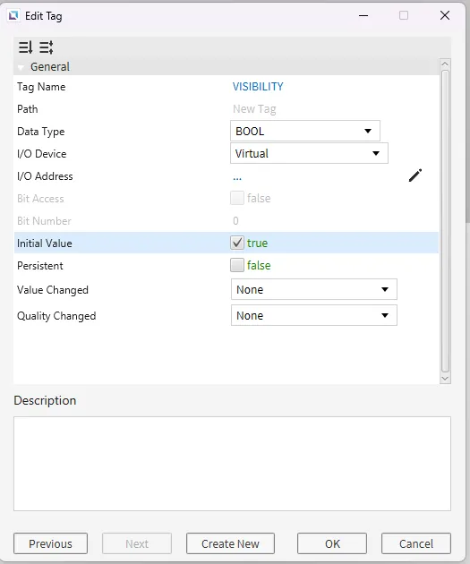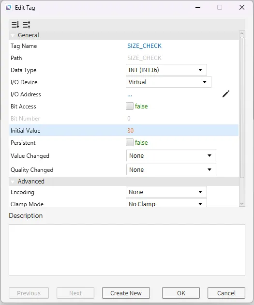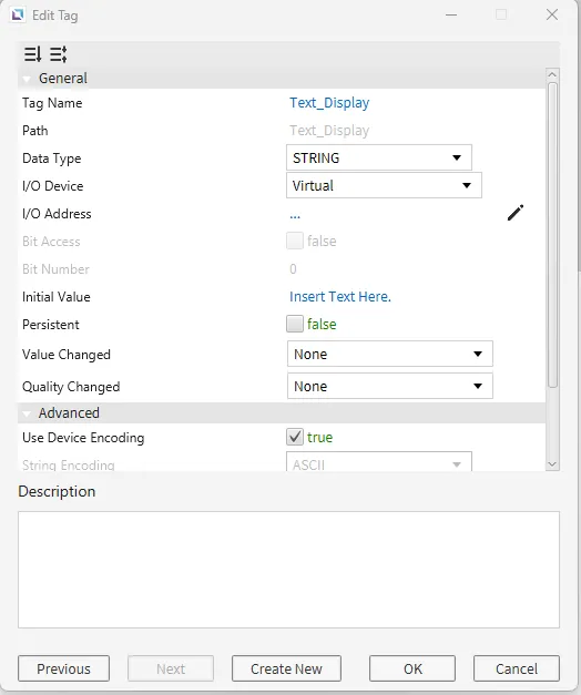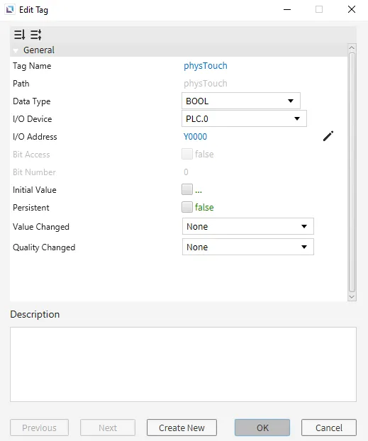 - Create six tags. To create a new Tag, go to Tag Editor and click on the Add Tag button to begin creating the tag. Create the following tags: Size_check as an INT (INT16), with an Initial Value of 30. Visibility as a BOOL. Set the Initial Value to True. Text_Display as a String. The Initial Value will be “Insert Text Here.” Another Tag called “Date/Time”. Click the Pencil next to the I/O Address on the Edit Tag Page and select System in the Type dropdown. Then, under Value, select Datetime String. Click OK to save the changes and click OK again to exit. Now create a tag named “Uptime”. Click the Pencil next to the I/O Address on the Edit Tag Page and select System in the Type dropdown. Then, under Value, select System Uptime (MS). Click OK to save the changes and click OK again to exit. Lastly, create a tag called “physTouch.” This tag will be a bool, and the I/O Device will be “PLC.” The I/O Address will be Y0000. (Note: The user has already defined an I/O device named “PLC” in this example. If your I/O Device has a different name, then enter that name into the I/O Device field. Likewise, if the I/O address format differs, use the correct form for your PLC).