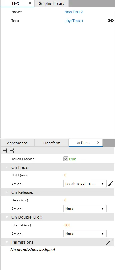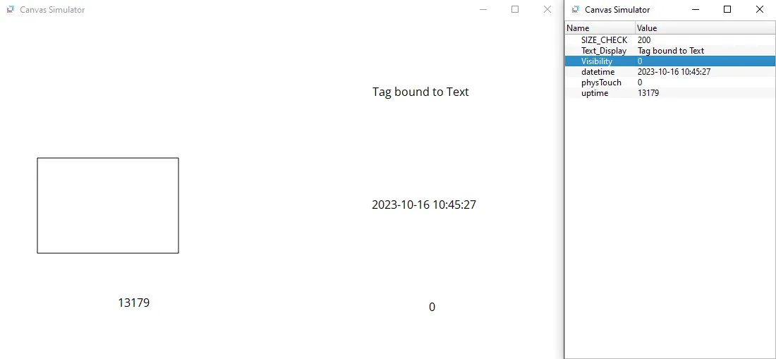 - Connect the Tags to the objects, first for Text_Display. Click and drag Text_Display onto the Text Box created. This will automatically bind the tag to the Text within the Text box and display the current String. For Visibility, click on the ellipse under Appearance and hover over Visibility until an Icon appears on the right side. Click this Icon, and under Tag, select the Visibility Tag. Once selected, click OK. For Size_Check, bind this to the Width of the rectangle. To do this, select the Rectangle, go under Transform, then click and drag Size_check to Width. This will smart bind the tag to the Width of the Rectangle. For the last three Text boxes, drag either Datetime, Uptime, or physTouch into one of the text boxes. Then click and drag the last one into the remaining text box. For the text box with physTouch, go to the Actions tab. Then, under On Press, select the Create New Commands option. Make a Toggle Tag Value command, and bind the physTouch tag to the command. Click OK to save the changes and exit out.