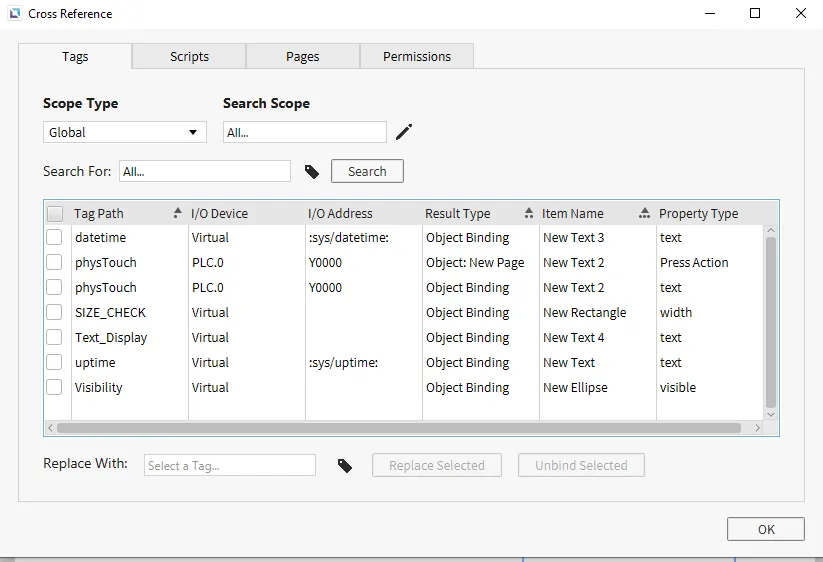 - Use the Cross Reference tool to confirm that tags are correctly bound without checking each object. To use it, press F3 or go to Tools > Cross Reference. This will display the current tags bound to the project and the property they are attached to. Use this to confirm if the tags are bound to the correct part of the object.