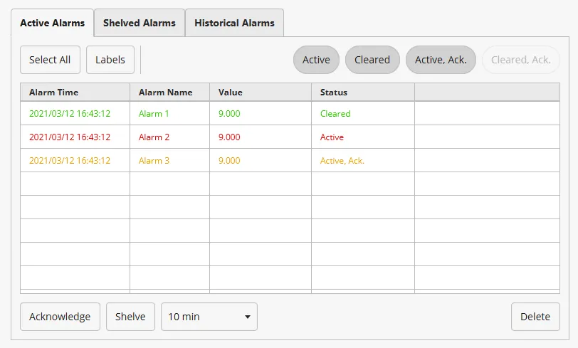 Green text means the active alarm was resolved.