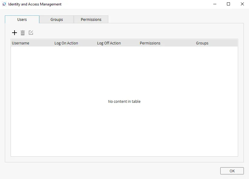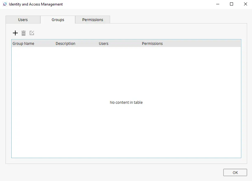 Groups are used to organize users under an umbrella to give permissions to multiple users at one time. To create a group, click the Group tab in the Identity and Access Manager window. Once on the Group tab, click the +, or Add Group, icon to create a group. Multiple users and permissions can be placed under the newly created group.