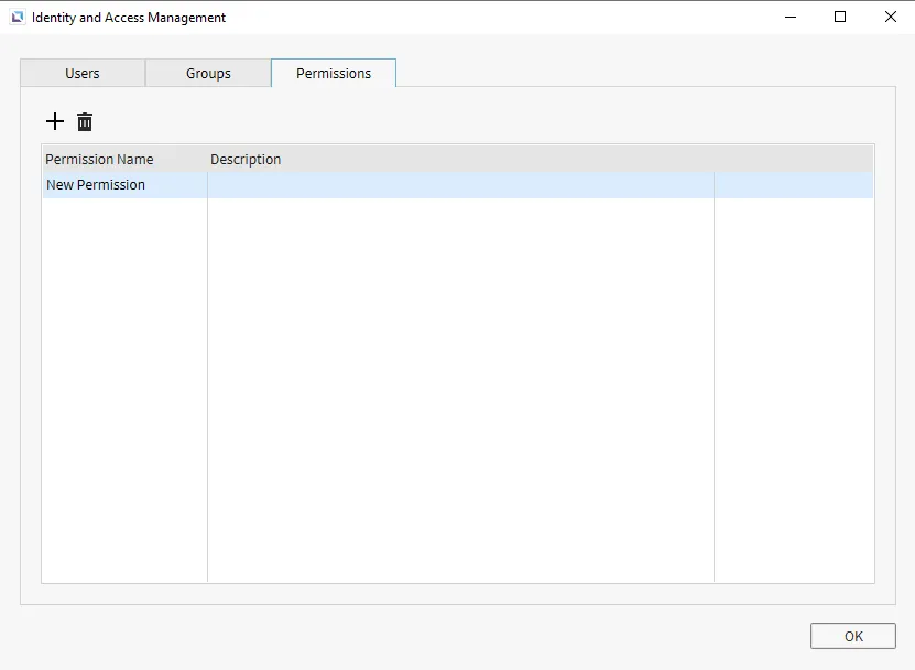 Permissions give users access to specific functionalities and prevent unauthorized access to particular portions of the program. To create a permission, first go to the Permissions tab. Once in the Permissions tab, click the +, or Add Permission, icon to make a new permission. A description can be added by double-clicking the description field and typing the description.