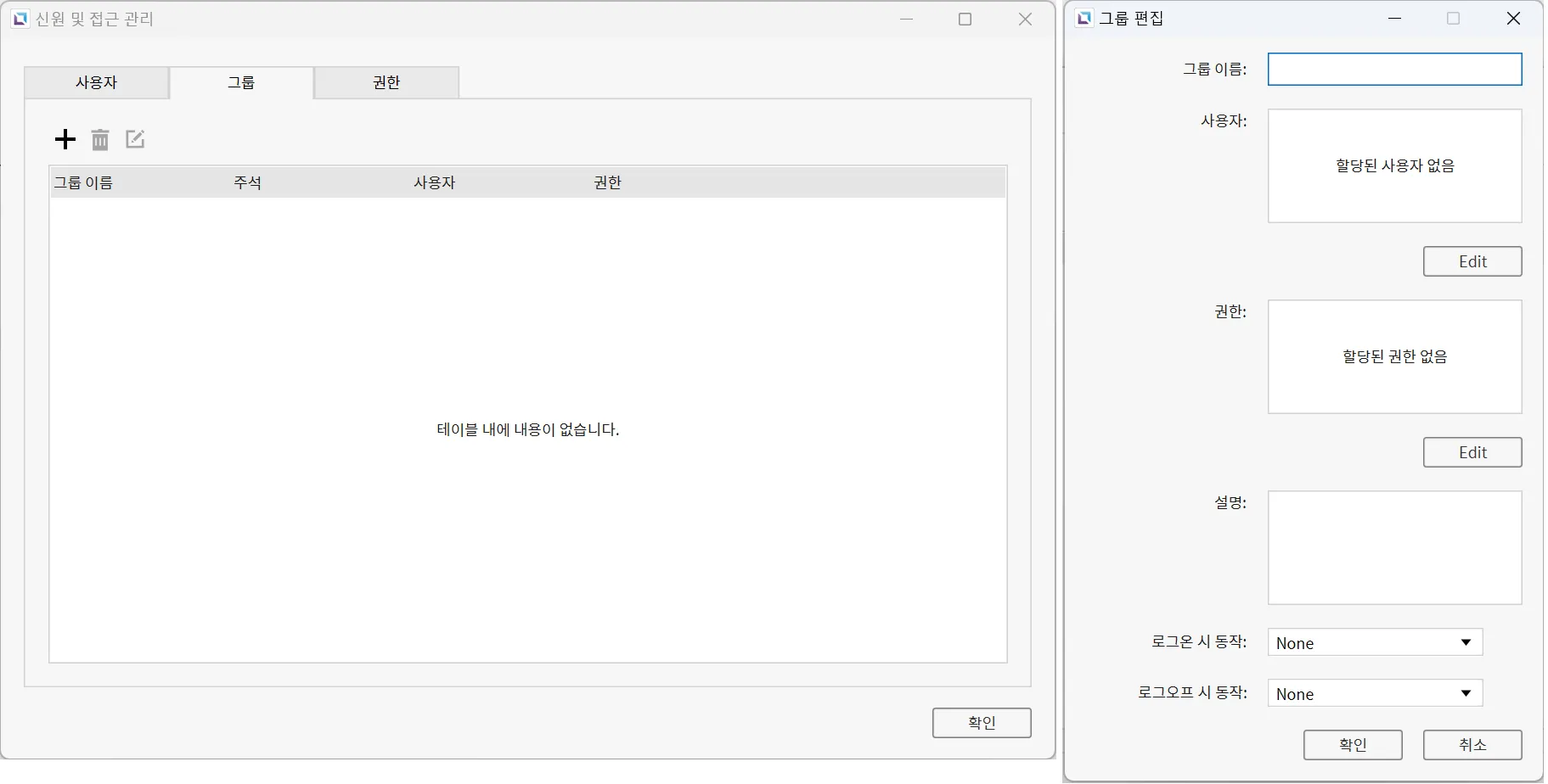 그룹은 그룹에 속한 유저들에게 공통적으로 권한을 부여하고자 할 때 사용하기 용이한 기능입니다. 그룹을 생성하려면 그룹 탭에서 + 아이콘을 눌러 생성을 할 수 있습니다. 그룹 편집 창에서 해당 그룹에 포함될 사용자 여러 명을 추가할 수 있고, 그 그룹에 속한 사용자들에게 공통적으로 부여할 권한을 설정할 수도 있습니다.