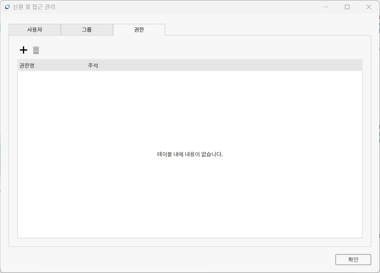 권한은 사용자들이 프로그램을 사용할 때 접근이 가능한 부분과 접근이 불가능한 부분을 구분하고자 할 때 사용합니다. 권한을 생성하려면 권한 탭으로 이동해 + 아이콘을 누릅니다. 권한에 이름을 부여한 다음 엔터 키를 누르거나 화면의 다른 영역을 클릭하여 권한 등록을 마칩니다. 주석 영역을 더블클릭하여 권한에 대한 상세 설명을 추가할 수 있습니다.