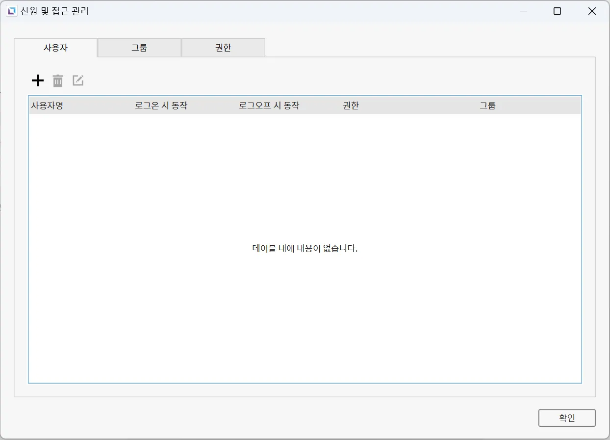 사용자에게는 각각 고유한 권한이 주어지거나 로그인/로그오프 시 실행할 동작을 설정할 수 있습니다. 사용자 탭에서 + 아이콘을 클릭하여 새 사용자를 추가할 수 있습니다. 필요한 내용을 전부 설정한 다음 확인을 눌러 사용자를 등록합니다. 사용자에 등록된 이메일로는 각종 설정을 통해 알림을 보낼 수 있습니다.