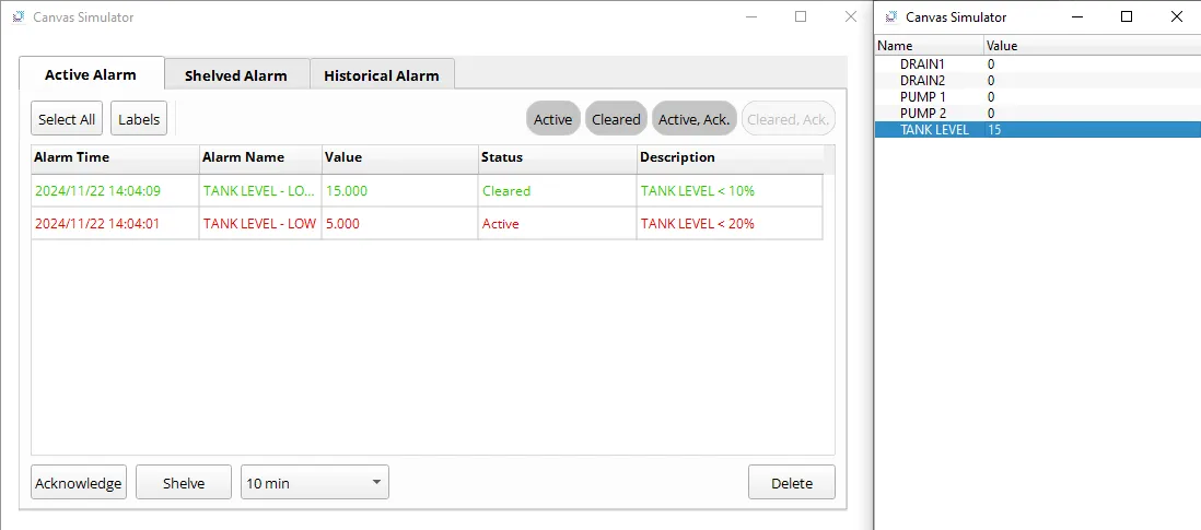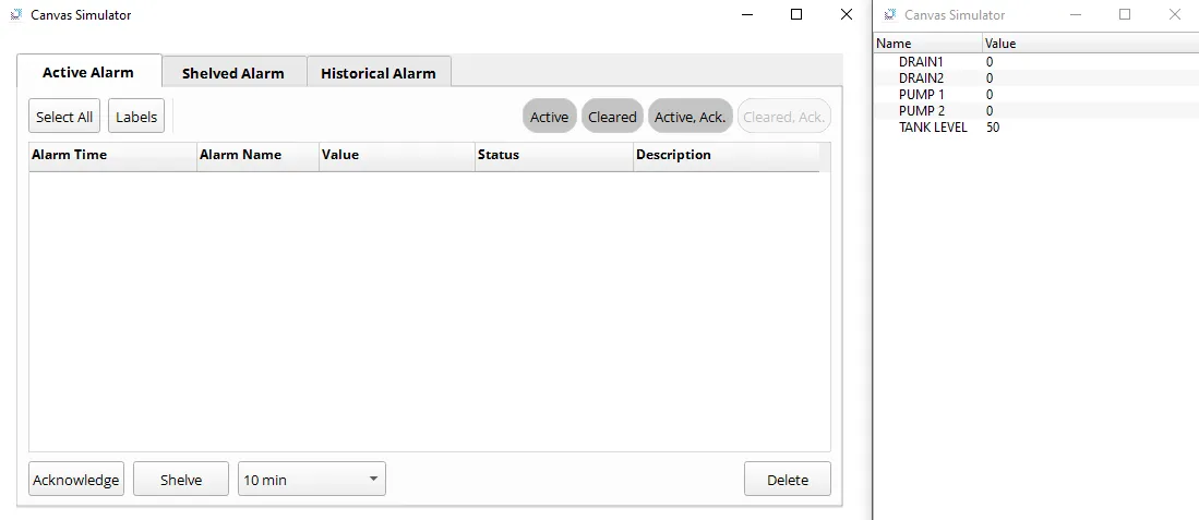 - Setting the TANK LEVEL to 50 will resolve all alarms, resetting tags DRAIN 1 and DRAIN 2 to 0 (false).