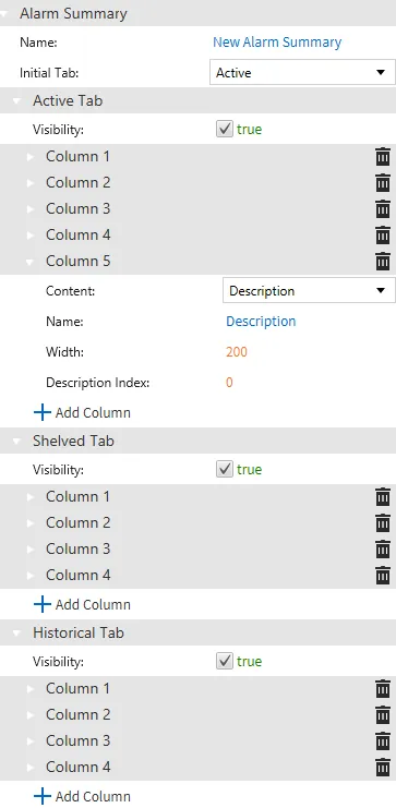 Change the parameters within the Basic Properties (Alarm Summary) pane to configure the Alarm Summary object. Add Column 5 to the Active Tab by scrolling down to just below Column 4 and pressing the + Add Column icon. Column 5 will automatically default to Description.