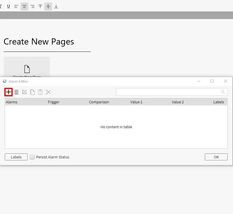 Section titled “Alarm Editor”Click Tools > Alarm Editor to bring up the Alarm Editor window, as shown below: