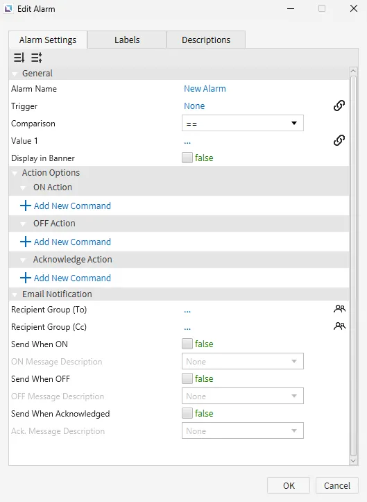 This window contains the Alarm Settings, Labels, and Descriptions tab that users can customize for created alarms.