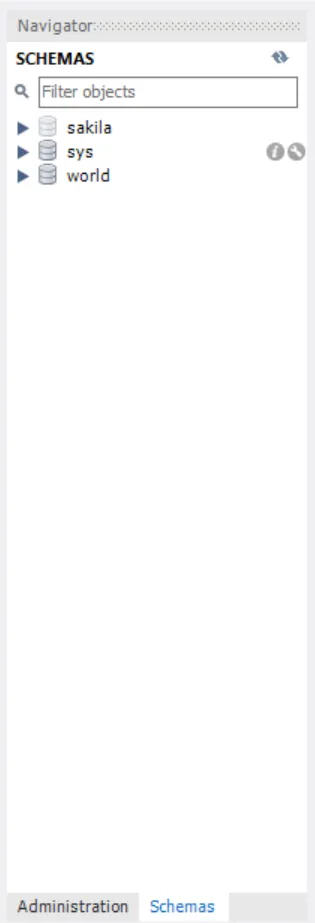 - In the navigator pane, go to the Schemas tab. This will show all databases and tables on the server.