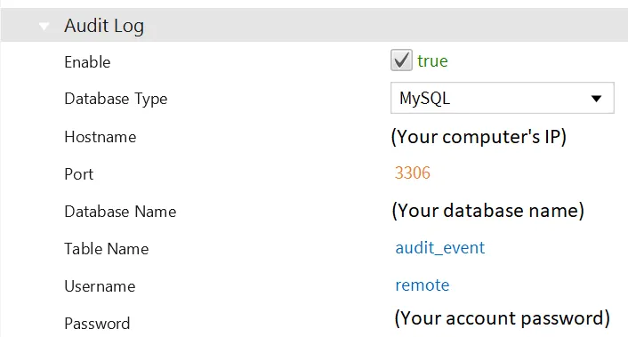 - In Canvas, open the Project Properties window, then go to Runtime Options > Audit Log. Use these credentials and the database name you created while installing MariaDB. The settings should look like this: